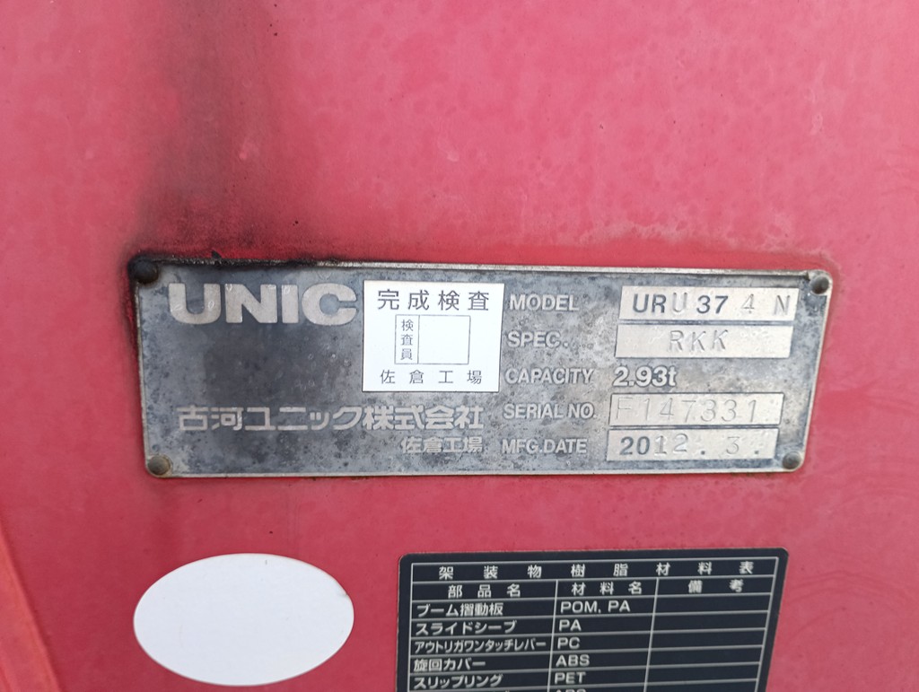 | 備考 | 日野自動車 木床 ロープ穴4対 古河ユニック URU374N 4段 フックイン有 |