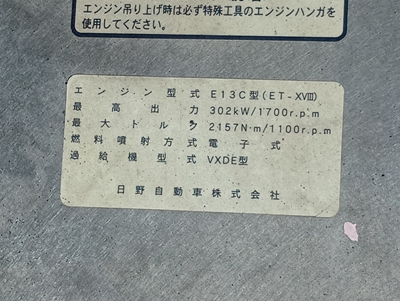 | 備考 | 第5輪荷重11,500kg リアエアサス ハイルーフ アルミホイール,タンク,サイドガード メッキパーツ多数 |